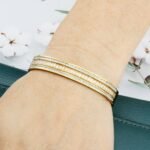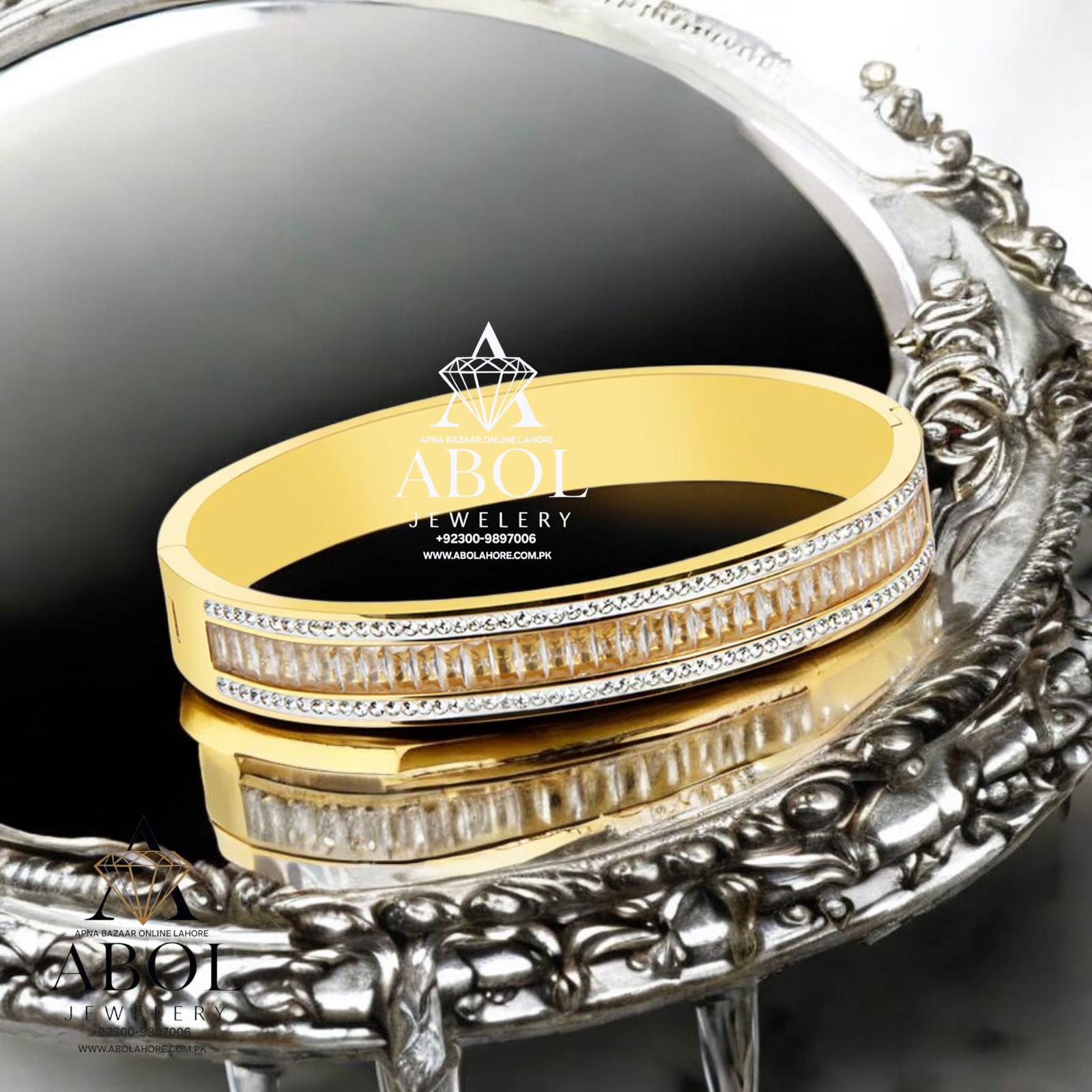 Elevate your style with this beautiful gold-plated cuff bracelet, a true statement piece. The wide, rigid band is expertly crafted and adorned with a meticulously set row of baguette-cut cubic zirconia stones that shimmer with every movement. This bracelet combines classic elegance with modern flair, making it the perfect accessory for both special occasions and everyday luxury.