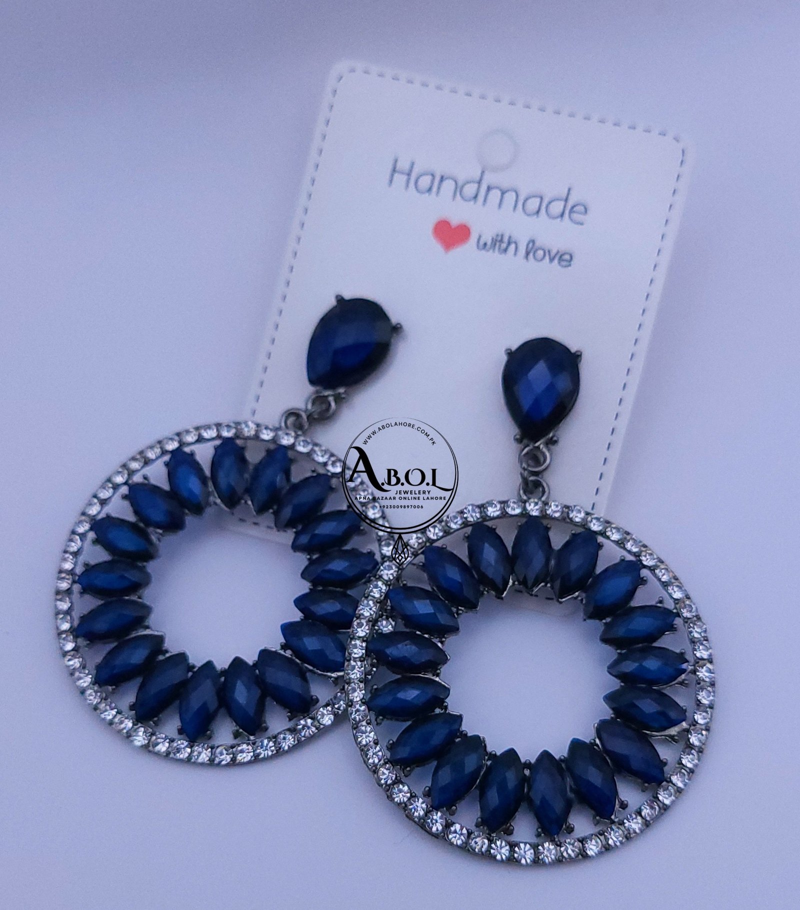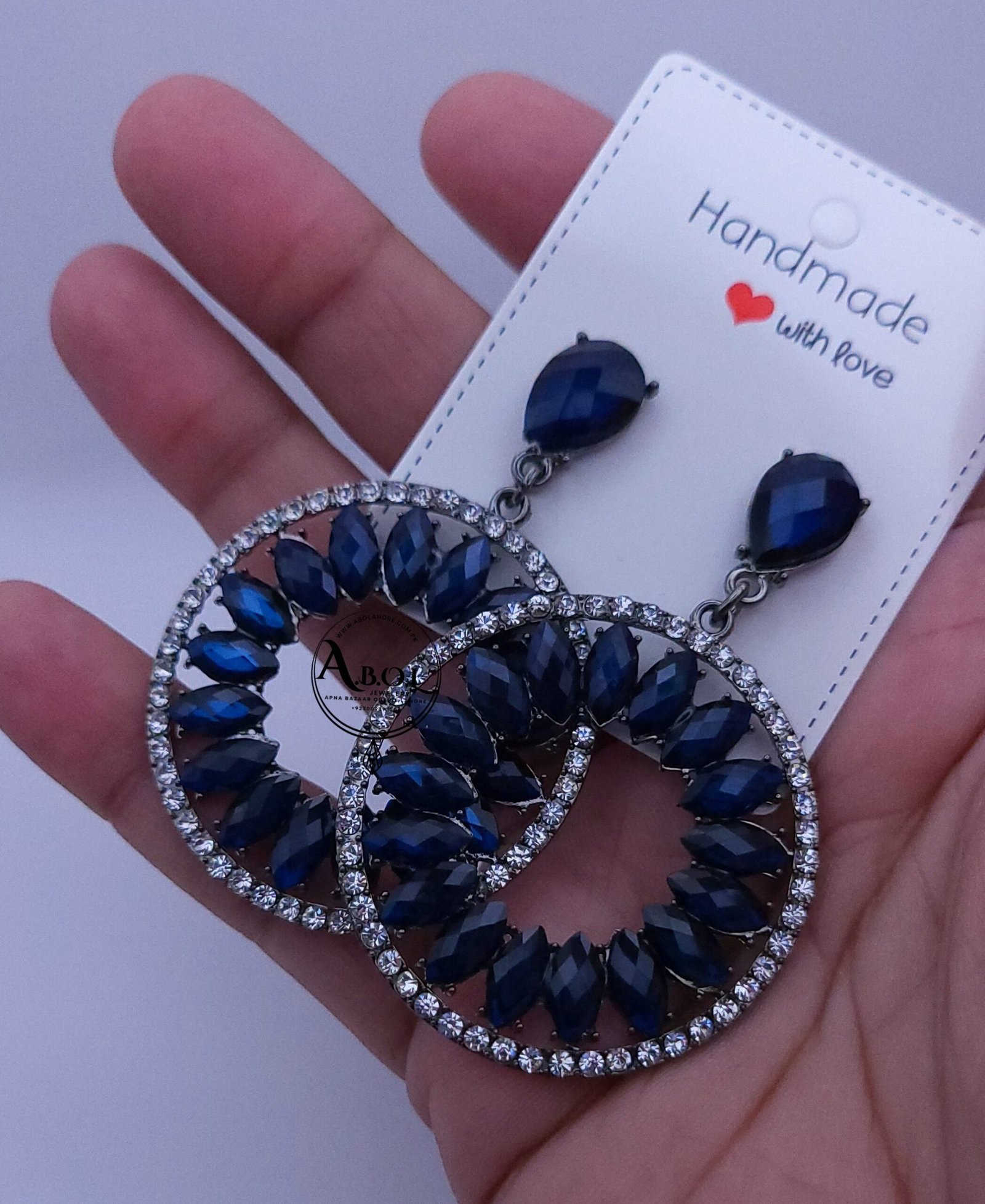 Featuring bold navy blue gemstones arranged in a circular pattern, accented with sparkling rhinestones for a glamorous touch. Perfect for adding a sophisticated flair to any outfit.