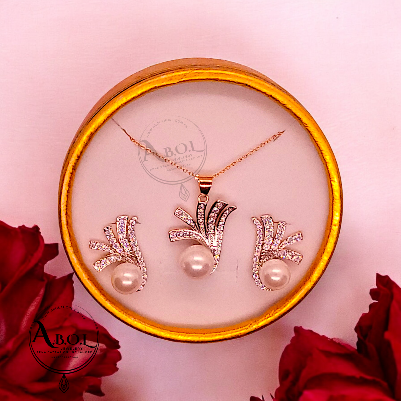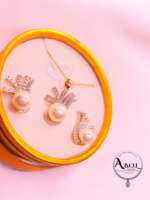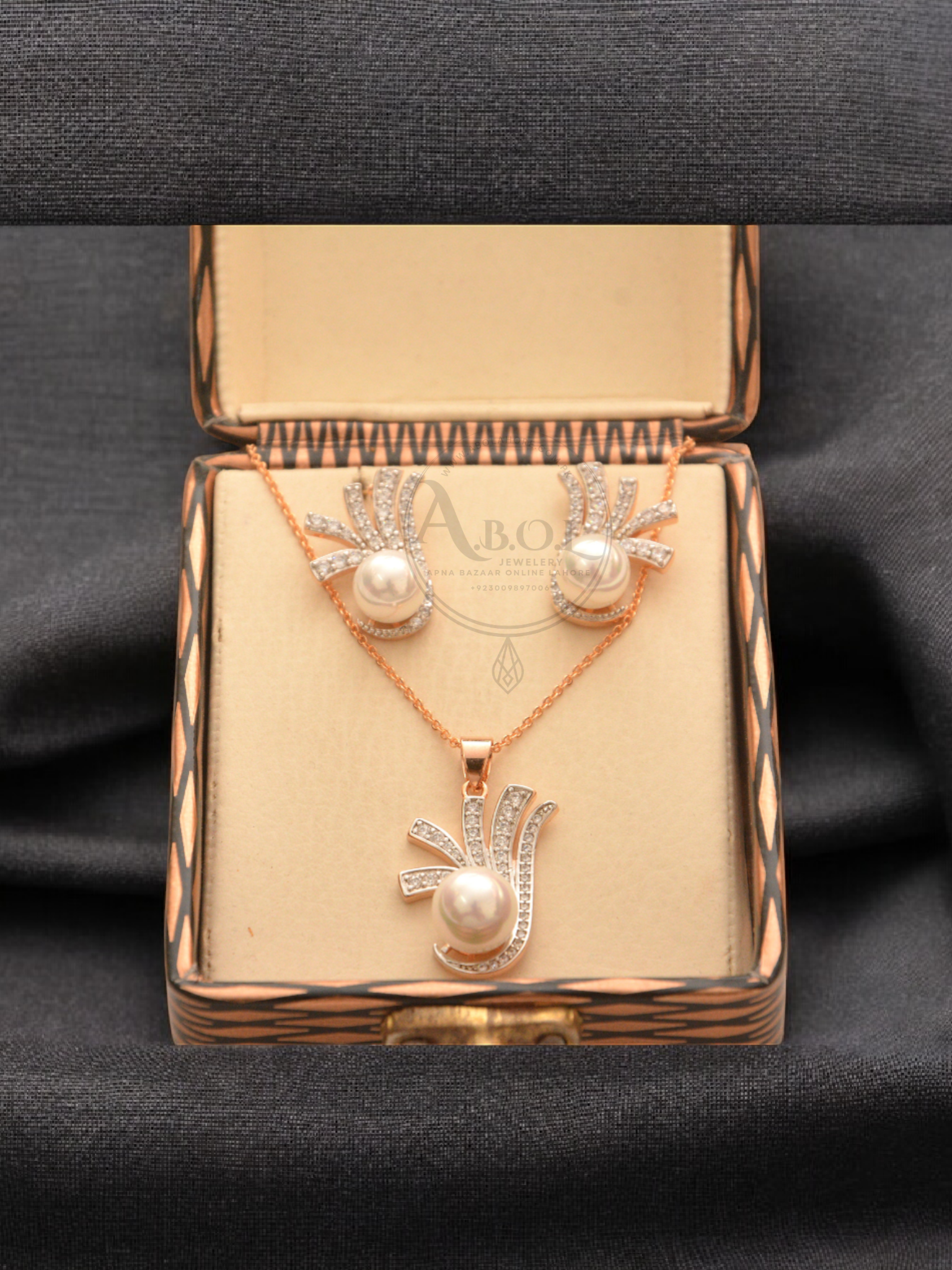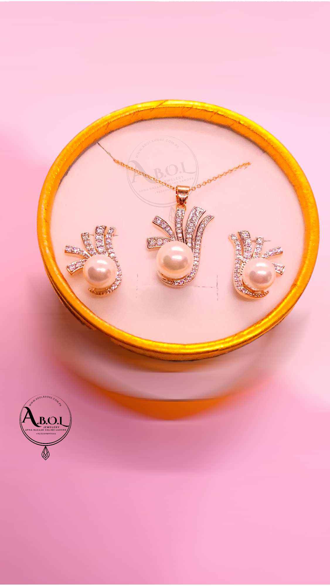 A sophisticated gold-tone jewelry set featuring a graceful pearl pendant and matching earrings, accented with sparkling stones. A timeless design is perfect for adding elegance to any occasion.