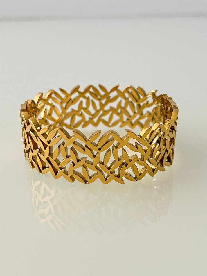 Crafted with stainless steel, this vintage-inspired piece features intricate hollow leaves for a unique touch. The convenient side opened push closure ensures a secure fit.