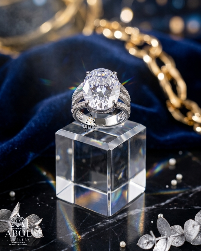 Make an unforgettable impression with the Empress Ring. This luxurious piece features a massive oval centerpiece cradled by a contemporary multi-band shank. The intricate stonework along the bands adds a layer of texture and brilliance that sets it apart from the rest. Elevate your jewelry collection with this masterpiece of craftsmanship.